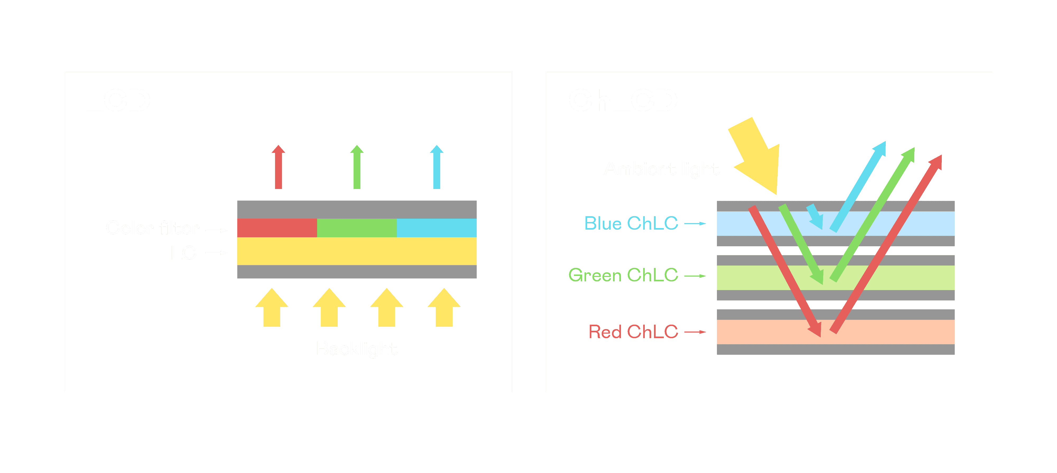 ChLCD 胆固醇液晶就如同纸张一样,,,透过反射环境光来显示影像,,,因此长时间观看不易造成人眼视觉疲劳,,,可达到护眼效果。。当处于户外阳光下使用,,LCD 影像容易失真而不易观看,,,但胆固醇液晶仍可维持较佳的影像品质。。。