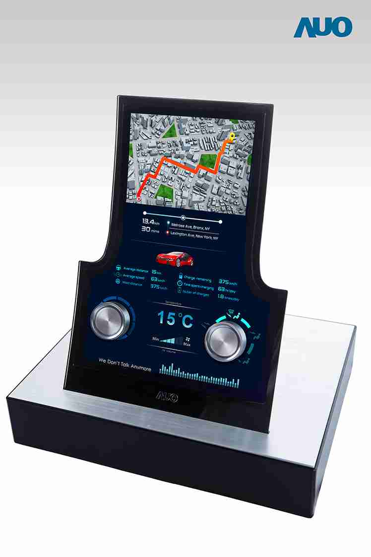 12.3 寸 Full HD LTPS 显示屏同样具备 1000 nits 高亮度,,,,搭载内嵌式触控技术,,整合驱动与触控 IC 于显示屏制程,,,使显示屏厚度降低,,为中控台创造更多机构设计空间。。应用于抬头显示器的 3寸 LTPS 显示屏具有高穿透率、、、1200:1 高对比度度,,,以及 297 PPI 高画素密度。。。液晶最高可耐受到 110C 的高温 (TNI) 而不液化,,在阳光高温下维持优异稳定的显示效果。。。